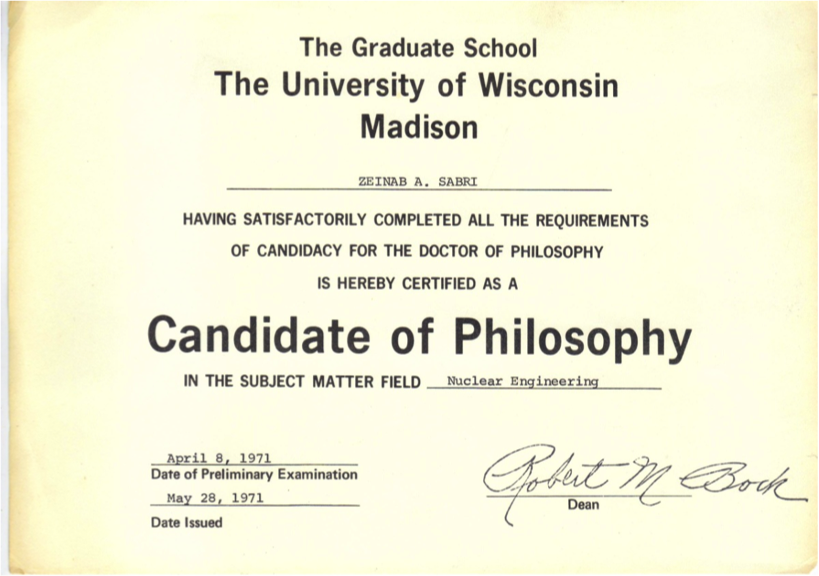 Dr. Sabri earned her Ph.D. in 1972 from the University of Wisconsin-Madison, with a major in Nuclear Engineering and a minor in Biochemical and Chemical Engineering. Her dissertation was on applications of Plasma Torch. She had a M.Sc. in Nuclear Engineering from the University of Wisconsin-Madison. Her B.Sc. in Engineering (Communications) was from Alexandria University, Egypt. She had also a Diploma in Wire and Wireless Communications.